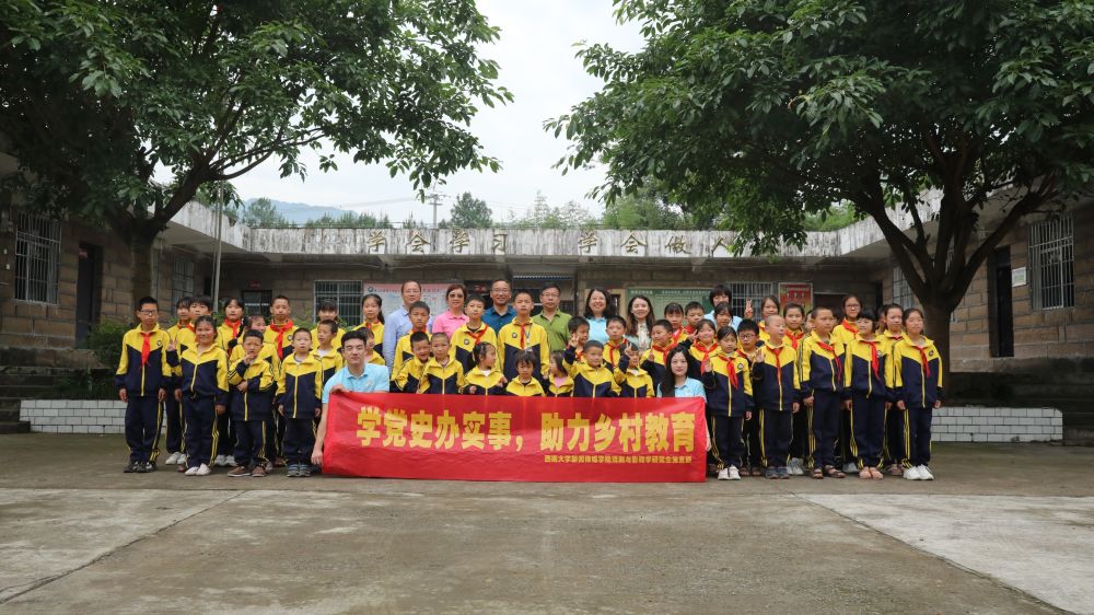 图为新闻传媒学院研究生党员与遥河村小学师生合影留念