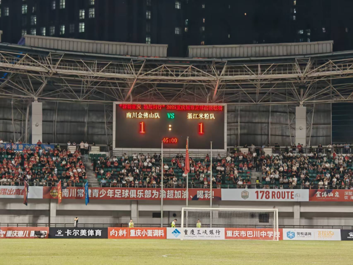 开场后,綦江米粉队迅速占据主动,利用边路突破持续施压,南川金佛山队则通过快速反击和定位球制造威胁。第37分钟,綦江战术手抛球发动进攻,2号球员蔡锐廷后点抽射破门,打入綦江米粉队渝超首粒进球。上半场补时阶段,南川金佛山队10号球员抓住角球混战机会补射破门,将比分扳平。